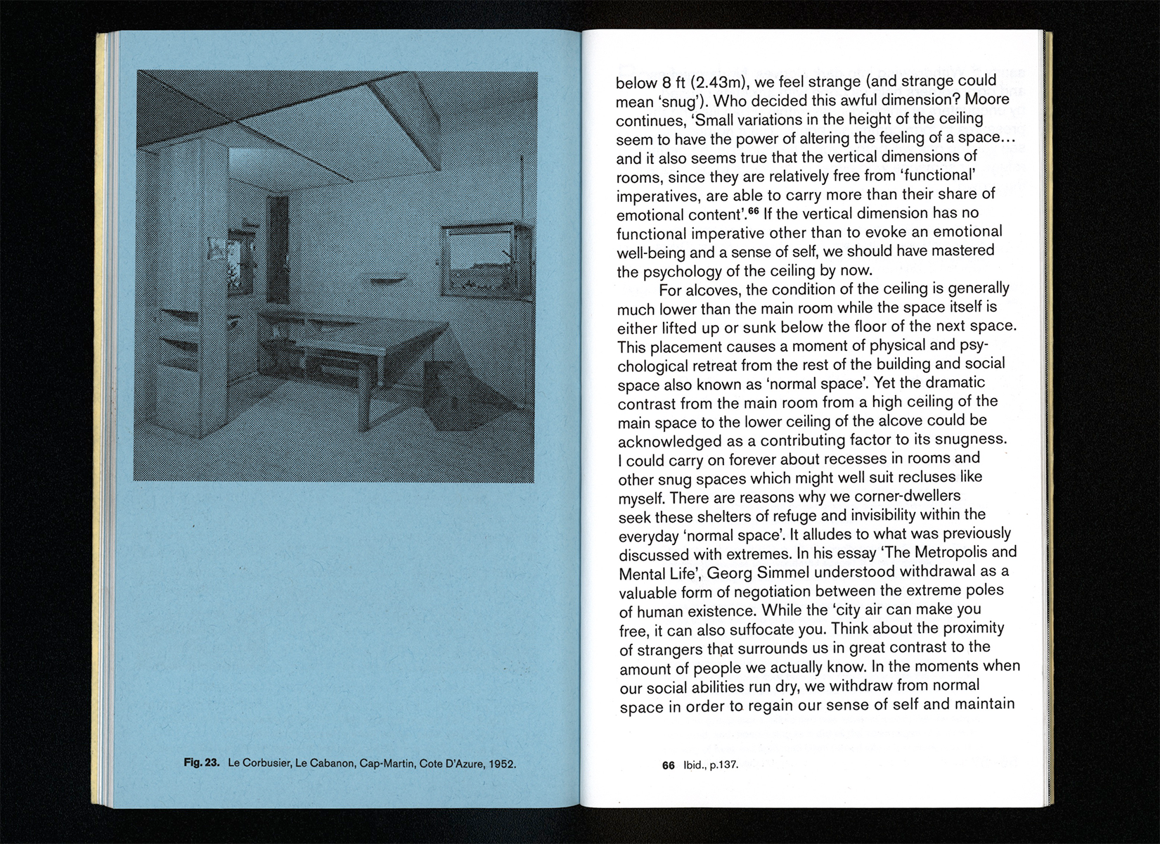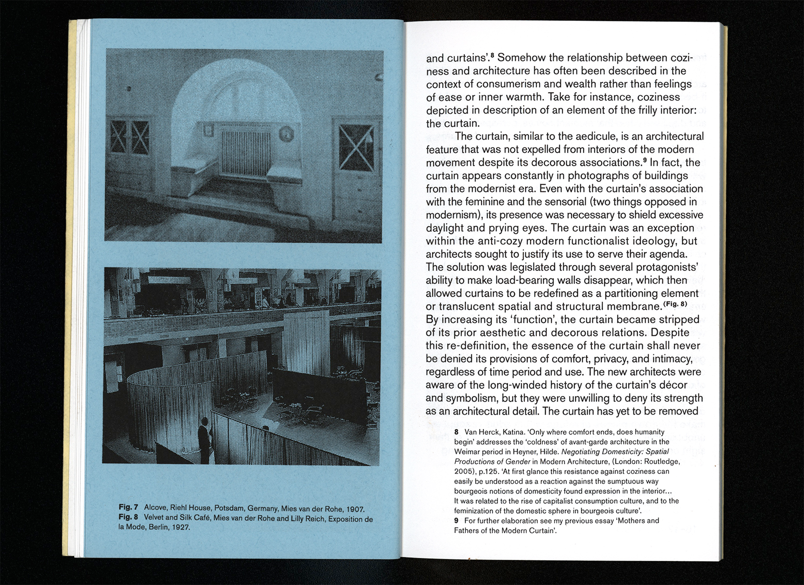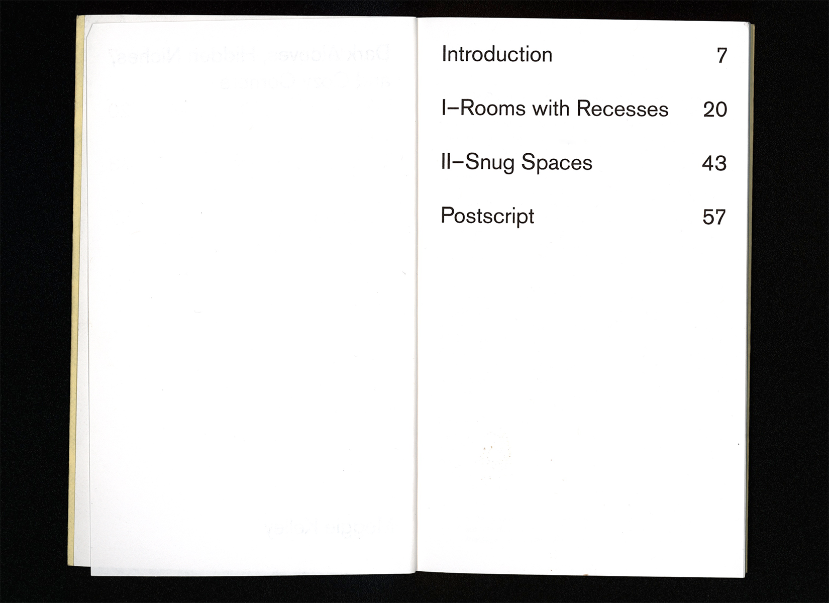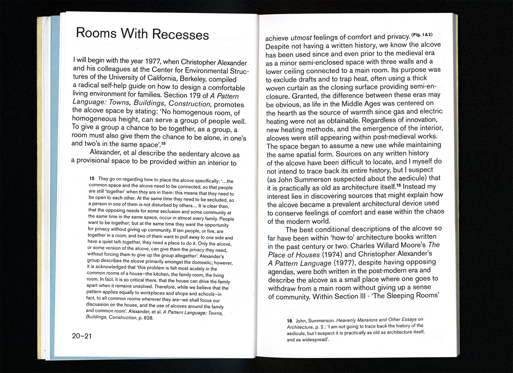 Dark Alcoves, Hidden Niches, and Cozy Corners looks at the appeal of the alcove as a retreat within social spaces, satisfying dual needs for privacy and a sense of belonging. Kelley explores the architectural device's history and use over the past two centuries, even during modernism's push for open, uninterrupted space.