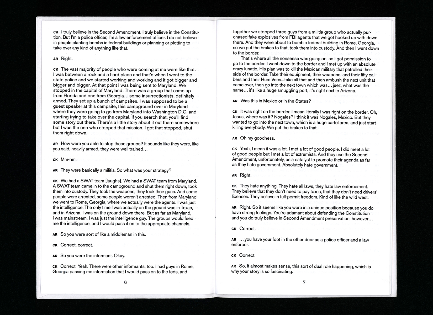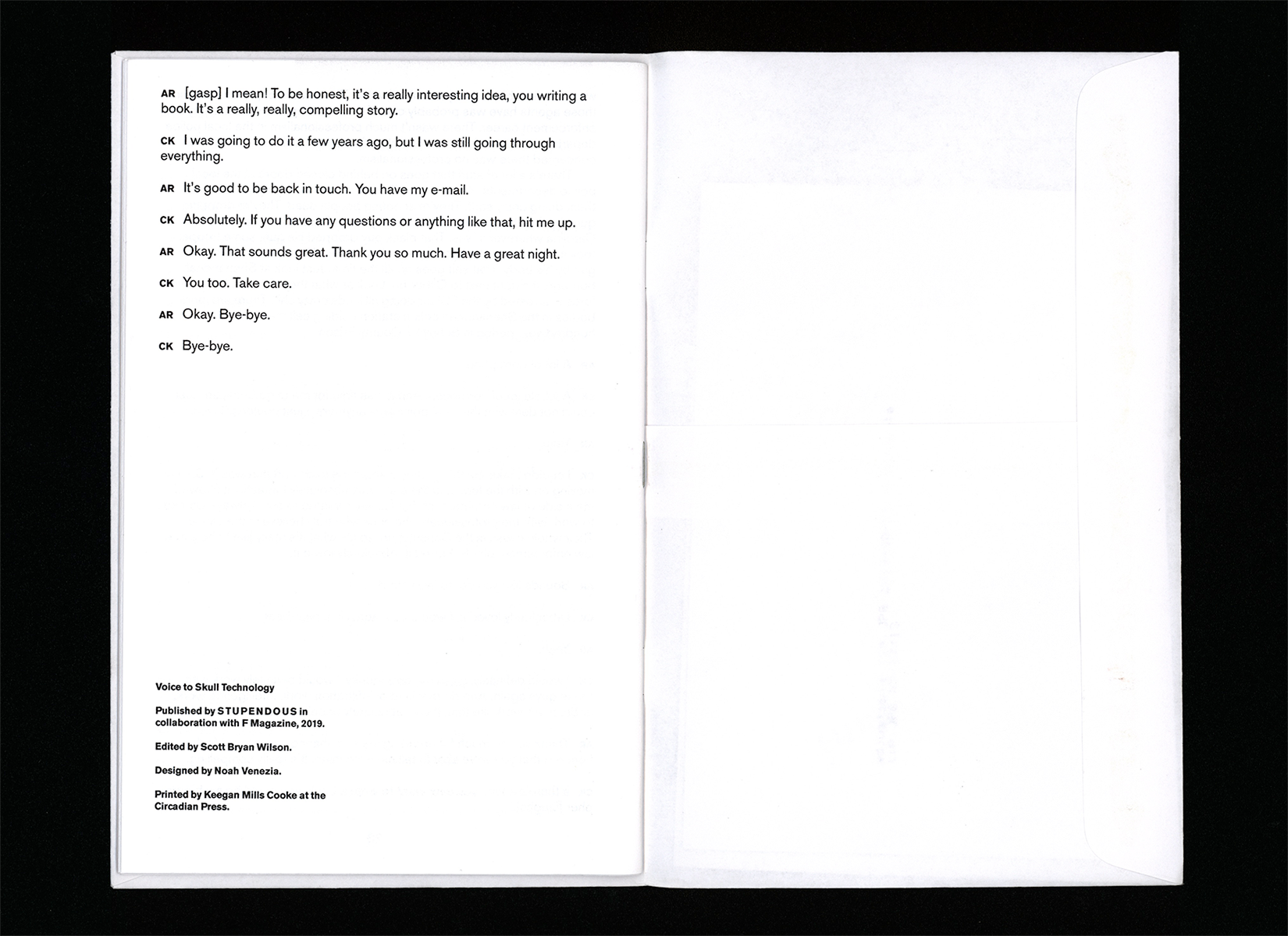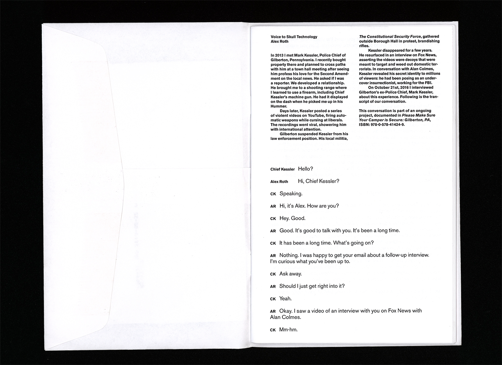 Voice to Skull Technology is the transcript of a 2016 interview conducted by artist Alex Roth with ex-Police Chief of Gilberton, Pennsylvania, Mark Kessler. It is the first compendium to be released as part of the ongoing project documented in Please Make Sure Your Camper Is Secure.